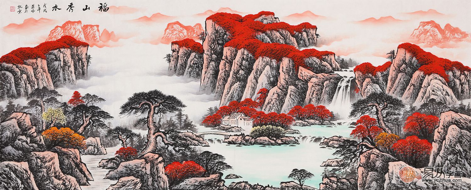 红色,在中国被看作是吉祥、喜庆之色。这幅聚宝盆山水画,以红色为主色调,画中岚峰起,云层环绕,枫林披覆,鸿运普照,溪水潺潺;作品大气磅礴,气势宏大,中心的主山巍峨,高入云端。瀑布从高处流到山下,寓意着财源不断,源水长流。山脚下有两三处房屋,自然而毫无违和感,背靠大山,即有贵人相助,好运连连,真是鸿运当头!