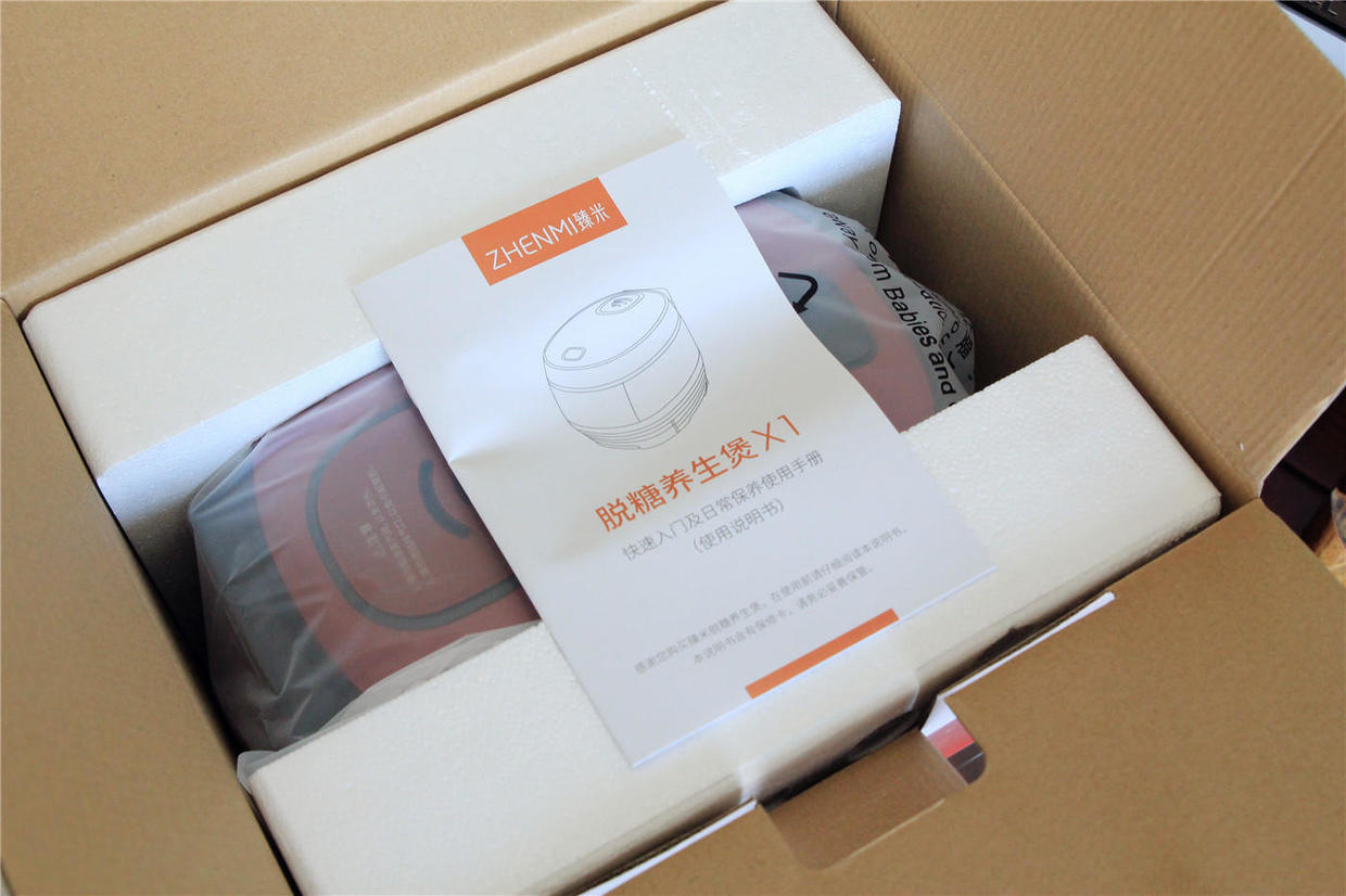 包装内部采用了双层泡沫缓震,正面是说明书,由于这款养生煲跟一般的电饭煲不一样,使用前详细阅读说明书,以便更好的使用产品。