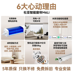 全球知名的智能家居及门窗电机制造商。杜亚(DOOYA)品牌是全球领先的门窗电机制造商,杜亚(DOOYA)坚持以“持续研发、忠于品质、服务顾客”为质量方针,凭着创新的产品和优质的服务享誉全球。体验明星产品,尊享优质服务。专卖店将产品与服务完美结合,为消费者提供最直观的产品展示和高效的线下服务。杜亚(DOOYA)电动窗帘采用进口ATMEL芯片,外壳使用航空铝合金材质,轻筒机身可承重50公斤,厚重窗帘不在话下;除了遥控器正常操作外,此款支持天猫精灵或小爱同学进行语音控制,以及进行定时开关等智能体验。搭配天猫精灵/米家APP、实现手机控制。
