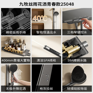 - 国内大型的卫浴洁具产品制造商和供应商之一。九牧创立于1990年,是一家集科研、生产、销售和服务于一体的综合性整体厨卫制造商,在全球拥有5大生产基地、16个工厂。如今,九牧在全球拥有4000多家五星定制店,销售网店50000多个,产品覆盖欧洲、美洲、亚洲、澳洲、非洲共超过30个国家和地区,与越南、阿联酋、卡塔尔、蒙古等11个“一带一路”沿线国家建立深度合作关系。九牧花洒外表圆滑光洁,流线型设计,打造人体舒适手持弧度,小巧精致,环保材料轻按软胶,污垢轻易排出,科学健康。加厚升降杆,角度可调节,左右旋转,适合各类人群,贴心肥皂盆,方便置放。优质不锈钢编织而成,不褪皮,生斑,水压再大也不必担心爆管或漏水。龙头精铜制造,连续开关7万次以上。
