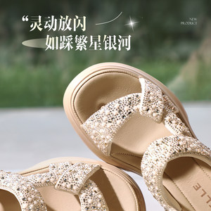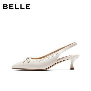 百丽羊皮气质粗高跟包头凉鞋女夏新款钻带绝美银色浅口单鞋F5F1D