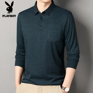 花花公子真口袋中老年t恤男长袖宽松全棉40岁50商务爸爸有领上衣